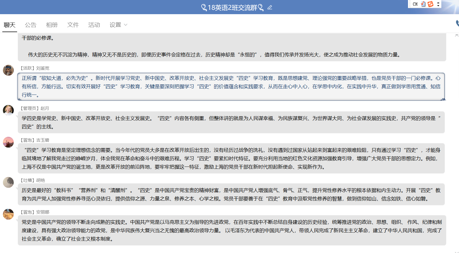 为贯彻落实习近平总书记关于深入学习党史、新中国史、改革开放史、社会主义发展史的重要指示精神,进一步教育引导广大青年学生全面了解我们党成立以来、新中国成立以来以及改革开放以来的重大事件、重要会议、重要文件、重要人物,了解我们党领导人民进行艰苦卓绝的斗争历程,深刻认识红色政权来之不易、新中国来之不易、中国特色社会主义来之不易、党领导人民取得抗疫斗争重大战略成果来之不易,我院各团支部通过线上学习、讨论以及共同观看爱国主义影片,分享观后感等方式展开,虽然不能面对面交流,但形式多样,内容丰富的活动还是使大部分同学都积极参与了进来,进一步了解党的“四史”的深刻的内涵和深远的意义。