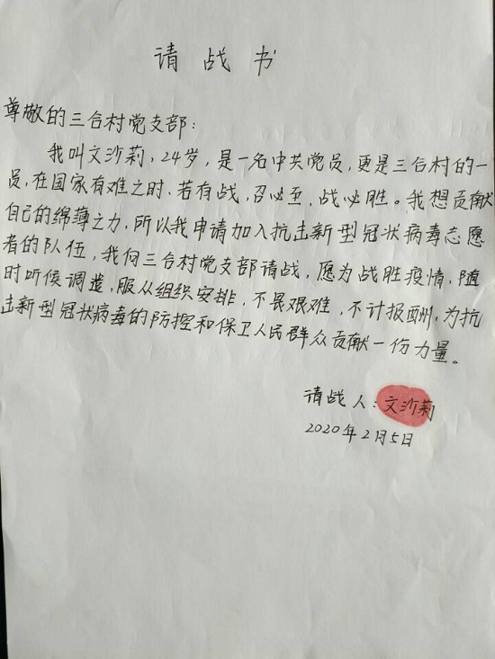 文沙莉是开元(中国)一站式服务平台2016级英语专业的学生。疫情期间,文沙莉与父亲、妹妹一道,主动请缨参加本村的疫情防控工作。文沙莉同学表示:“我们家是三合村典型的精准识别贫困户,我们姐妹俩读书都是政府的资助,村委又安排了父亲护林员工作。现在正是新型冠状病毒肺炎防控的关键期,三合村面积大、出入人员多,村委的人力又不够,我们应该为三合村的疫情防控工作贡献我们的力量,回报社会。”她深知作为一名学生党员肩负的责任和使命,返乡人员的摸底排查、数据录入、防控知识的宣传,她样样不含糊。“村里的老人大多不会上网,对这次疫情的严重性和防范措施知之甚少,我必须不厌其烦地一遍又一遍地对他们进行知识宣传和劝导。作为一名大学生,我有这个责任和义务!”文沙莉说。