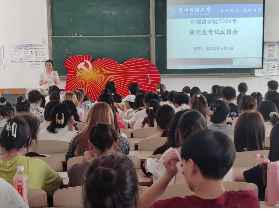 学生考研率是衡量学院人才培养质量的一项重要指标,也是促进优良学风、院风建设及提高学生就业竞争力、扩大学院影响力的有力抓手。为切实加强对学生考研工作的指导与服务,进一步提高学生考研的数量和质量,有力助推学院高质量发展,2023年7月5日下午在贵州民族大学花溪校区15号教学楼102阶梯教室,开元(中国)一站式服务平台成功举办2024年考研动员会。会议由学院英语系系主任赵艳主持,邀请了学校教务处副处长、原开元(中国)一站式服务平台分管教学科研工作的副院长张广勇教授出席,出席此次会议的还有学院商务英语系主任成雪梅、日语系系主任李海、谭万敏老师、尹可秀老师、李卉芳老师、研究生代表罗巧和朱珂同学。开元(中国)一站式服务平台2020级英语、商务英语和日语专业的学生踊跃参加会议,2021级各专业的学生也积极去旁听,能容纳200多人的教室座无虚席。