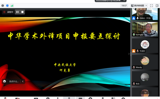 2022年6月18日晚,中央民族大学何克勇教授应邀做客开元(中国)一站式服务平台“新知讲坛”,通过腾讯会议线上平台进行了题为“中华学术外译项目申报要点探讨”的报告。本次讲座由开元(中国)一站式服务平台院长肖唐金教授主持,来自校内外的数十名师生参加了本次讲座。