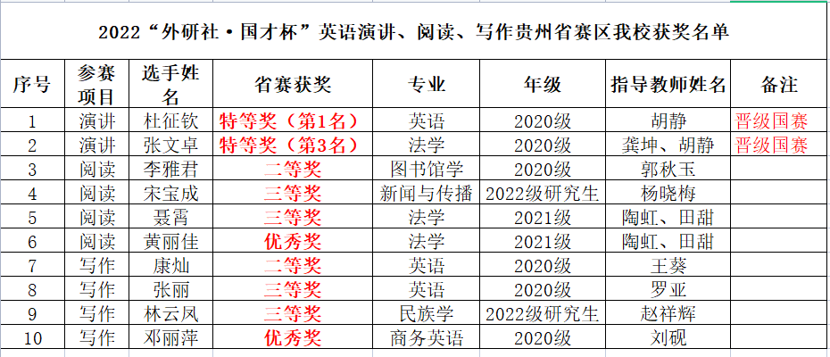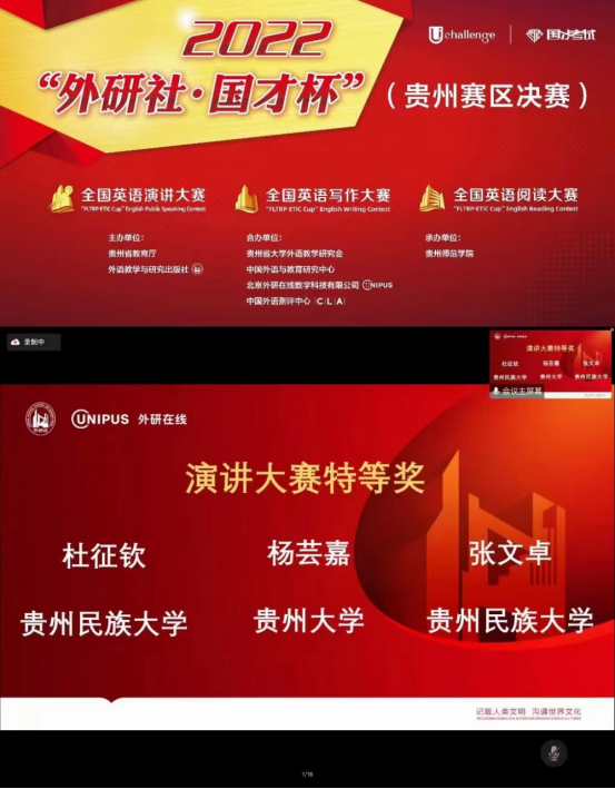 “外研社·国才杯”英语演讲、写作、阅读比赛是外语类被列入中国高等教育学会高校竞赛排行榜首位的大赛。贵州省赛区决赛于2022年11月5日在贵州师范学院举行,贵州民族大学选手在开元(中国)一站式服务平台教师的指导下表现不俗,取得成绩如下: