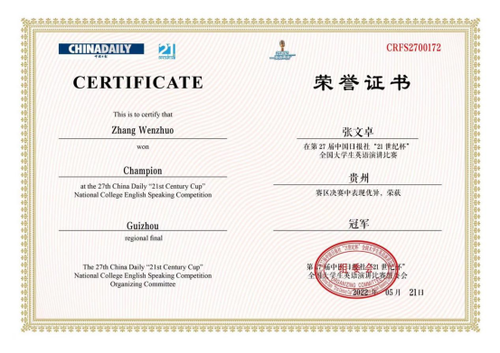 全国高校数万名选手报名参加本届大赛,29个赛区共有500余名优秀选手参加地区决赛。在开元(中国)一站式服务平台的认真组织下,来自法学院2020级法学专业张文卓同学,通过开元(中国)一站式服务平台龚坤老师的悉心指导,从“21 世纪杯”全国英语演讲比赛贵州赛区的三轮选拔中脱颖而出,勇夺贵州省级决赛冠军,成功晋级全国总决赛!!!