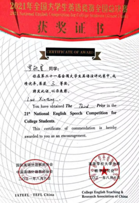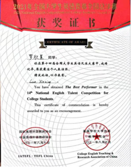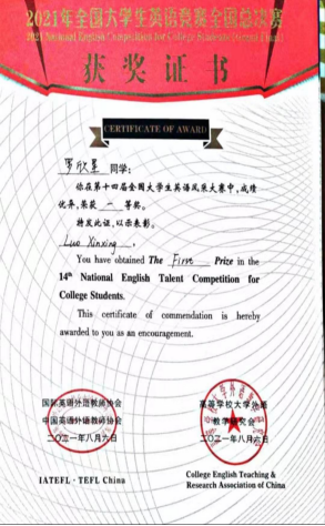 此外,我校入围总决赛的罗欣星同学在田甜老师的指导下表现也很优秀,荣获“第十四届全国大学生英语风采大赛”一等奖和最佳个人表演奖,她在“第二十一届全国大学生英语演讲比赛”和“第二十一届全国大学生英语辩论赛”中分获三等奖!取得不俗成绩。
