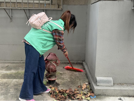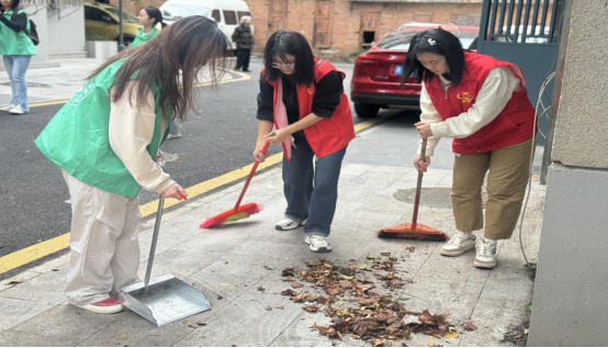 图为 志愿者清扫树叶