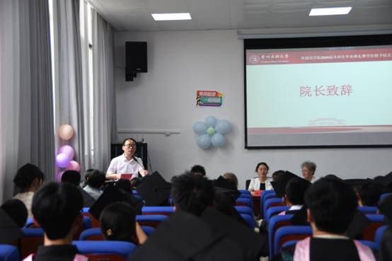 院长张广勇致辞。他回顾了毕业生们在校期间的成长历程,对毕业生们顺利完成学业表示祝贺。他勉励毕业生们要勇于担当、敢于创新,在未来的工作和生活中不断追求卓越,并对大家未来的发展寄予了厚望。