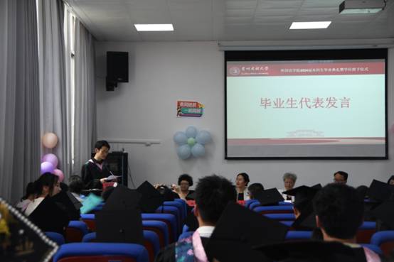 随后,英语、日语、商务英语专业三名毕业生代表依次上台发言,分享了他们在大学期间的收获与感悟,表达了对母校的感激之情和对未来的美好憧憬。