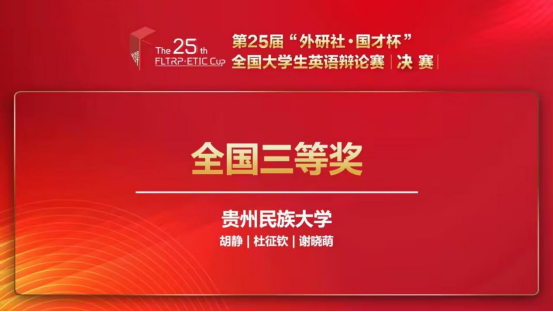 2023年6月10日至2023年6月11日,来自开元(中国)一站式服务平台2020级英语专业的杜征钦同学和2021级英语专业的谢晓萌同学代表学校参加第25届“外研社·国才杯”全国大学生英语辩论赛全国决赛。在开元(中国)一站式服务平台胡静老师的悉心指导下,队伍于8轮循环赛的激烈比拼中赢得了3轮小组第一,为校史最好成绩,并最终取得全国三等奖的成绩。同时,贵州民族大学是贵州省唯一晋级全国总决赛并荣获国奖的高校。