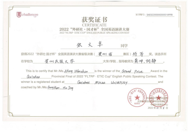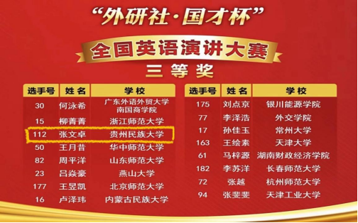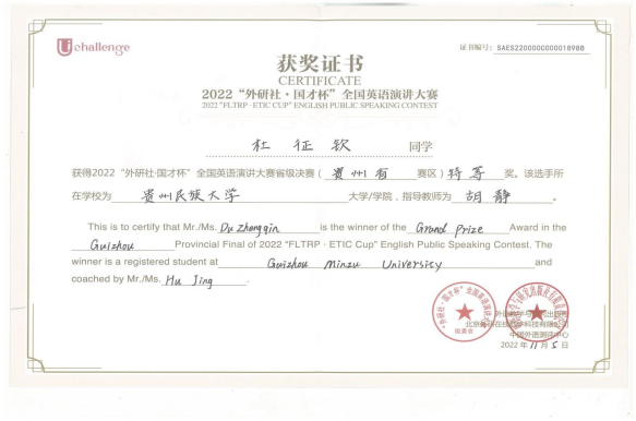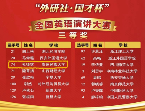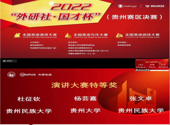 2022年11月5日“外研社·国才杯”英语演讲大赛贵州省赛区决赛在贵州师范学院举行,贵州民族大学选手在开元(中国)一站式服务平台教师胡静、龚坤的指导下喜获佳绩:杜征钦和张文卓从49名决赛选手中脱颖而出,摘取冠军和季军,均获省级特等奖,成功晋级全国总决赛!